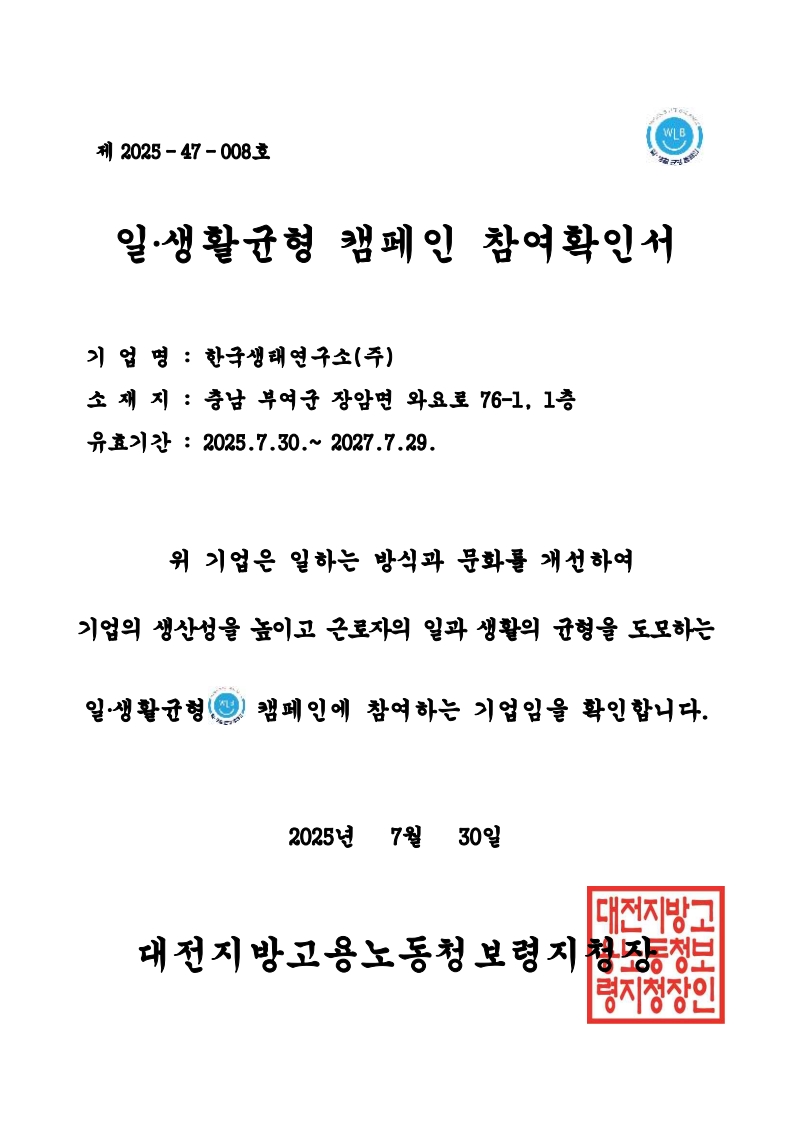 한국생태연구소(대표 남궁 형)는 대전지방고용노동청 보령지청으로부터 ‘일·생활균형 캠페인’ 참여기업으로 공식 승인을 받았다. 이번 승인을 통해 연구소는 자연과 사람 모두의 지속가능성을 실천하는 모범 환경연구기관으로 자리매김하게 됐다.