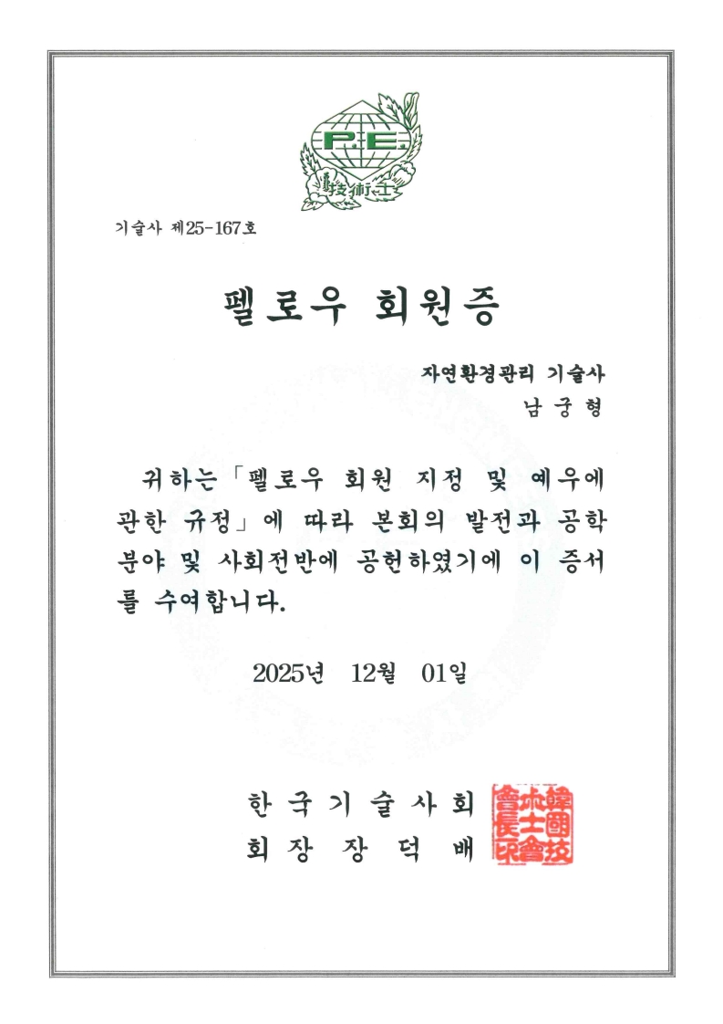 한국기술사회는 「펠로우 회원 지정 및 예우에 관한 규정」에 따라 기술 발전과 공익 증진에 뚜렷한 성과를 남긴 회원을 대상으로 엄격한 심사를 거쳐 펠로우 회원을 선정하고 있다. 남궁 형 대표는 환경·생태 분야에서 축적해 온 현장 중심의 연구 성과와 기술 자문 활동, 공공사업 참여 등을 통해 해당 기준을 충족한 것으로 평가됐다.